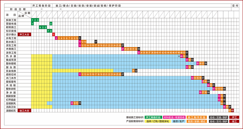 昌禾裝飾結合多年施工實踐,精心研發(fā)先進、穩(wěn)定、標準的魯班工藝施工體系,從開工籌備到竣工驗收,實行嚴格的節(jié)點控制,保證施工周期統(tǒng)一按標準推進,實現(xiàn)主材安裝的預排和分級管理,工序步步緊扣,全面確保家裝工程工期及質(zhì)量。
